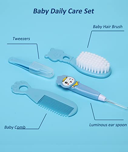 【Enhance Baby Sweet Adorability and Safety】1 Nasal aspirator with small, flexible tip for baby’s comfort. 2 Comfortable silicone finger toothbrush, clean baby’s teeth and tongue. 3 The illuminated LED ear spoon can easily clean and watch the baby’s little ears. 4 With the scale on the medicinal feeding spoon and dropper, more accurately and easy to feed baby. 5 Scissors with round blades will not poke baby