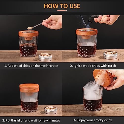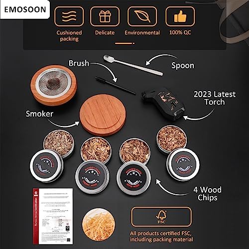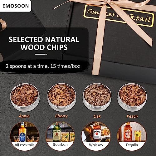 ✅DIVERSE FLAVORS – The Emosoon Cocktail Smoker Kit comes with four different fruit wood chip flavors (oak, peach, apple and cherry), it offers a diverse range of tastes and over 60 uses to complement your favorite drinks. Whether you’re smoking meats, sipping cocktails, enjoying whiskey or savoring bourbon, these wood chips are carefully selected to delight your taste buds. Experience unique flavors with different wood chips for different drinks.