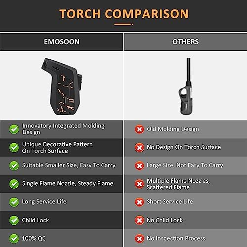 ✅SOLID AND DURABLE TORCH – The Emosoon Torch features an innovative integrated molding design and a unique decorative pattern on its surface, making every torch one-of-a-kind. Its compact size makes it easy to carry, while the single flame nozzle provides a steady flame for reliable lighting. With a long service life and a child lock feature, this lighter offers both durability and safety. You can also check the remaining butane through the inspection window.