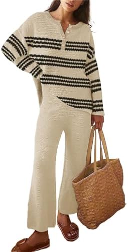 Women’s 2 Piece Sweater Set- Stripe Button Sweater Top+Wide Leg Long Pants