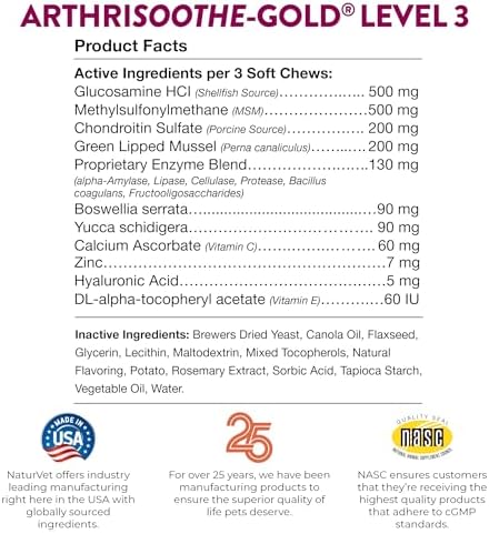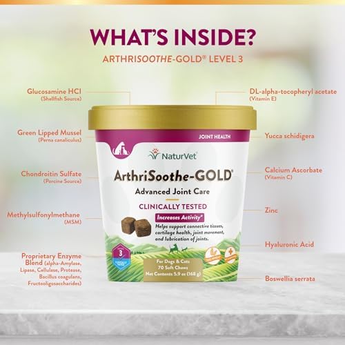 WHOLESOME DOG SUPPLEMENTS: NaturVet ArthriSoothe Gold Level 3 Advanced Joint Care features nutrients to support lubrication of joints and joint movements. Ingredients include chondroitin, MSM, glucosamine, green lipped mussel and hyaluronic acid.