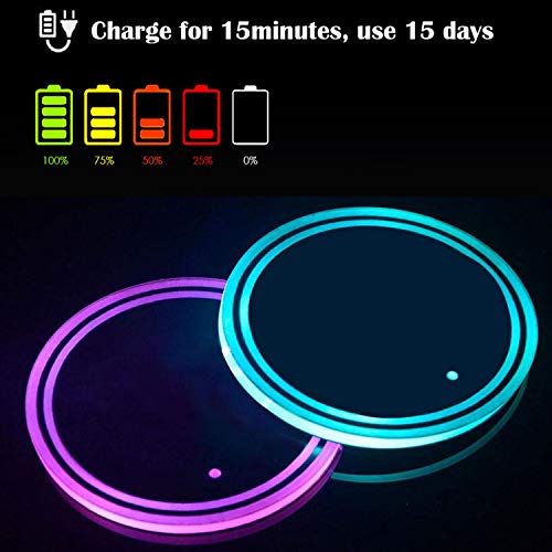 Specification: LED Cup Holder Lights, 2pcs Car Coasterss with 7 Colors Luminescent Light Pad, USB Charging Mat for Drink Coaster Accessories Interior Decoration Atmosphere Light.