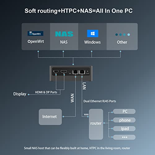 【All In One PC=Router+HTPC+NAS】 AK50 mini PC equipped with dual network ports and WIFI5, can be virtualized into multiple hosts through VMware ESXi. With Intel N5095 CPU, 16GB memory and 7mm Sata HDD Bay, you can install a variety of applications, including NAS (FreeNAS, Synology) for file management(DIY a 4-bay NAS), HTPC (EMBY, PLEX, JELLYFIN) for a private theater, and even software routers (OpenWRT/ddWRT/Tomato), firewall, NAT, Pfsense, and network isolation.