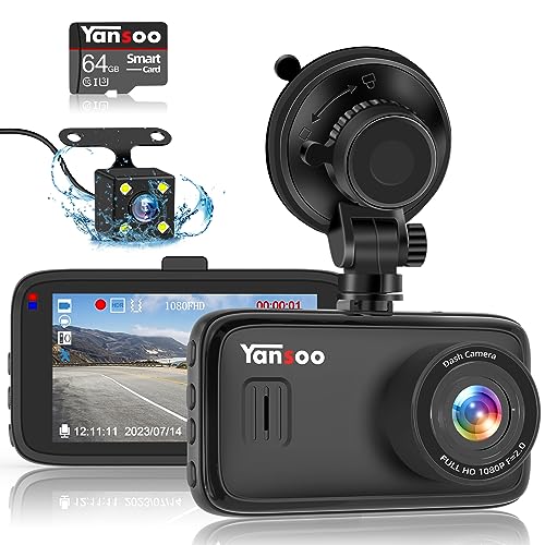 Dash Cam Front and Rear with 64GB SD Card 1080P FHD Dashcam for Car 170° Wide Angle Dashboard Car Camera With WDR Night Version, Car On-Dash Mounted Cameras Parking Monitor, Motion Detection, G-Sensor