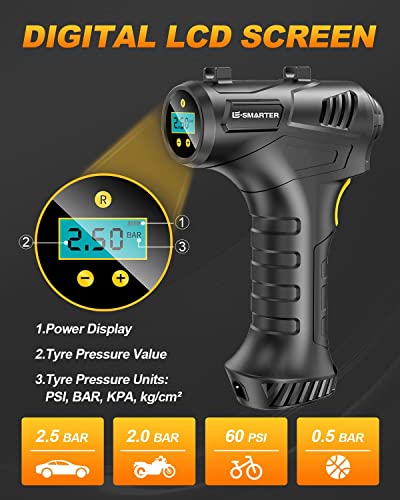 Specification: E-SMARTER Cordless Tyre Inflator Air Compressor, Handheld Car Tyre Inflator 12V, 150PSI Car Tyre Pump with 4 Nozzle Adapters, USB Rechargeable Battery, Car Pumps for Tyres, Car, Motorcycle, Bicycle