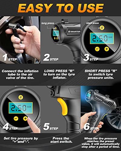 E-SMARTER Cordless Tyre Inflator Air Compressor, Handheld Car Tyre Inflator 12V, 150PSI Car Tyre Pump with 4 Nozzle Adapters, USB Rechargeable Battery, Car Pumps for Tyres, Car, Motorcycle, Bicycle