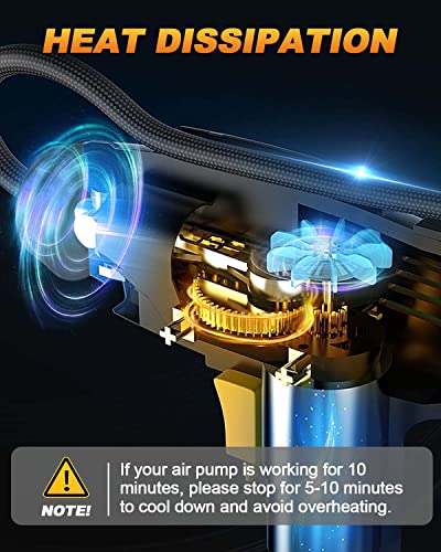 Fast Inflation- The tire inflator pump car boasts an impressive 150PSI maximum inflation pressure. When the 2 built-in 2000mAh rechargeable lithium batteries are fully charged, this car pump can easily inflate a standard mid-size car tire from 0 to 35 psi in just 3-5 minutes.
