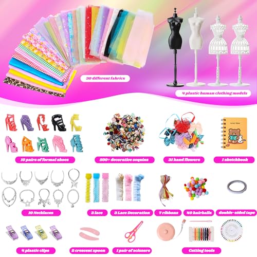 👗【600+ pcs Fashion Design Kit for Girls 】:30 pieces of colorful fabric + 6 ribbons with lace + 7 regular ribbon + 1 flower belt + 2 beaded belts + 30 bow decorations + 1 pack of shoes + 4 model stands + 1 pack of sequins + 1 pack of pins + 1 measuring tape + 1 pack of pom-pom decorations + 1 mini notebook + 1 pack of jewelry + 1 pack of needles and thread + 400+ pieces of buttons and other decorative items, etc.