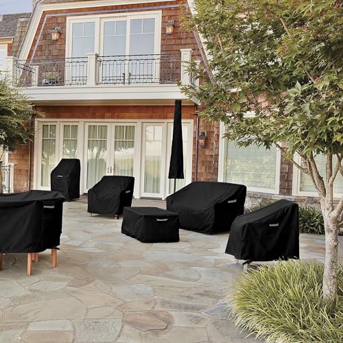 Premium Material — The breathable 420D Oxford fabric allows garden cover to discharge the water vapor inside quickly to avoid the growth of mold and keep the furniture dry. And thanks to the coating treatment, Dokon outdoor furniture cover could better protect your table and chairs against sunlight, rain, snow, wind, and dust