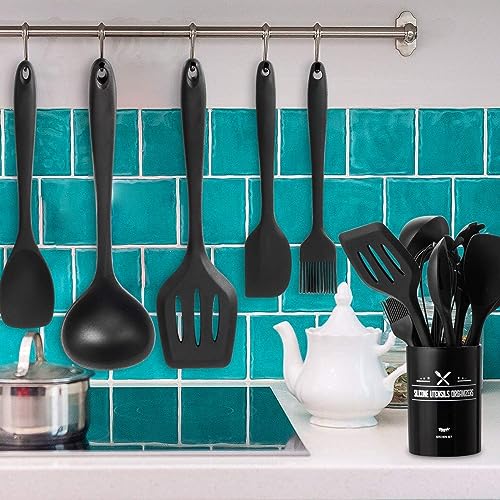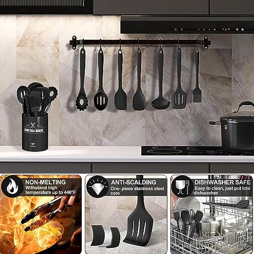 Wildone Silicone Kitchen Cooking Utensils Set, 15PCS Premium Spatula Set for Nonstick Cookware, Kitchen Tools Spatula Spoons Turner Brush Whisk, Heat Resistant (Black)