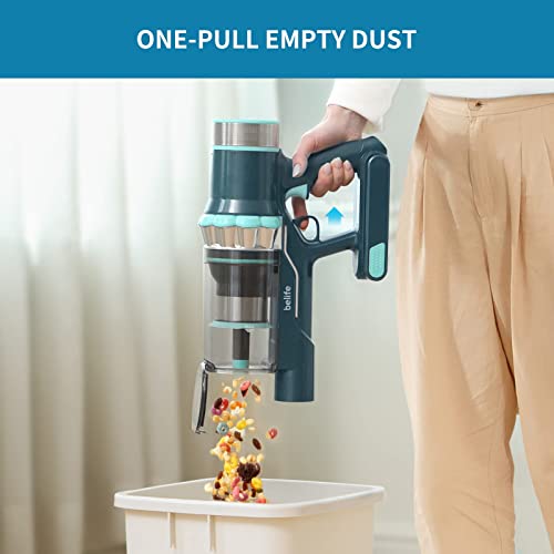 🏡22Kpa Powerful Suction & Ultra Quiet: Belife BVC12 cordless Vacuum Cleaner equipped with 380W brushless motor can up to 96,000rpm, generating 22Kpa suction power on max mode, which picks up pet hair, debris, dust and large particles from hardwood, marble & tile floor to low pile carpet, also generates less heat and noise compared with other regular brushed motors.