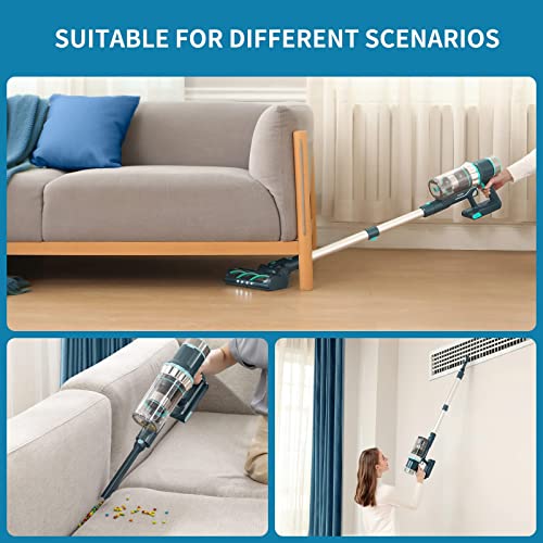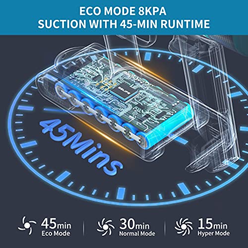 🏡Detachable Battery & Long Runtime: With 7*2500mAh rechargeable battery, the cordless vacuum provides an outstanding cleaning performance. Eco mode (8KPa, 45 mins), Normal mode (13KPa, 30 mins), and Hyper mode (22KPa, 15 mins); the detachable battery can be charged singly or on its main body within 4-5 hours, you can purchase an extra battery if you need extended runtime.