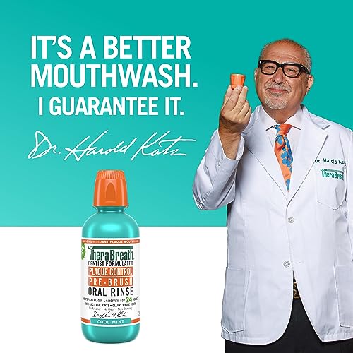 TheraBreath Plaque Control Mouthwash is specially formulated to use before brushing (pre-brush rinse). Like all TheraBreath mouthwashes, our Plaque Control Mouthwash is dentist-formulated with powerful breath freshening ingredients. The no alcohol formula doesn’t burn or irritate, and the Cool Mint flavor is gentle and refreshing.